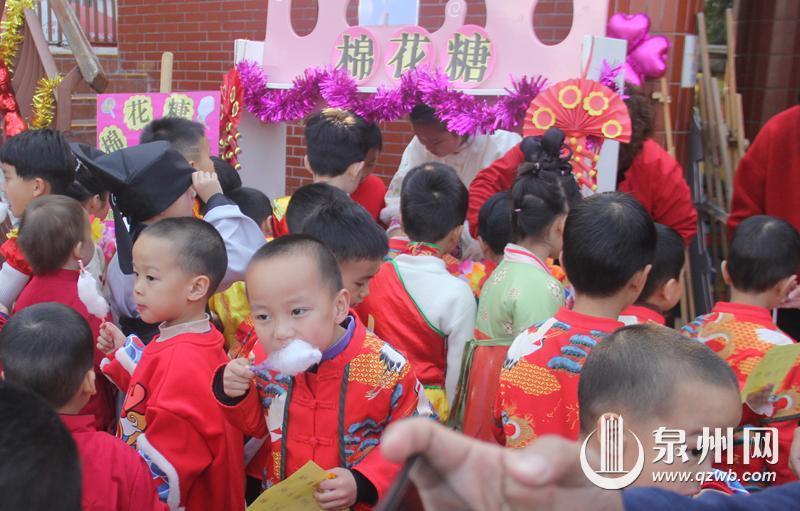 为了让孩子们沉浸式体验泉州海丝文化,该幼儿园邀请了非遗项目进校园,泉州木偶剧团张育淳表演传统剧目《小沙弥下山》、“江加走木偶头”传承人黄雪玲展示木偶头作品、金苍绣传承人陈克忍让孩子们对刺绣有了初体验……此外,无美食不庙会,冰糖葫芦、棉花糖、腊八粥、面线糊、茶果子、宋式点茶等满足了萌娃们的味蕾,糖画馆还让萌娃们体验了一把糖画制作,围炉煮茶、搓冬至丸、滚了元宵圆、包饺子、印龟粿,浓浓的年味萦绕在游园活动的每个角落。