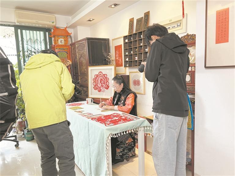 国家级非遗代表性传承人黄丽凤向节目组展示泉州(李尧宝)刻纸技艺(市文旅局供图)