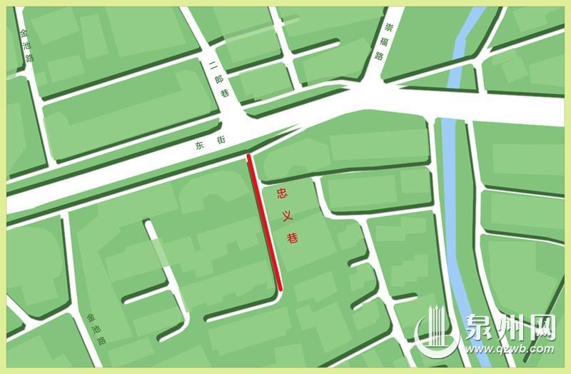 泉州鲤城区忠义巷,北起东街,南抵忠义宫。忠义宫是泉州古城东隅衮绣铺忠义境的境庙,位于古城七个城门之一的仁风门内,巷内曾有北宋名臣苏缄的义第,宅前立有“怀忠坊”,因此这条古巷被称为忠义巷,百余米的小巷内,忠义佳话已流传千年。