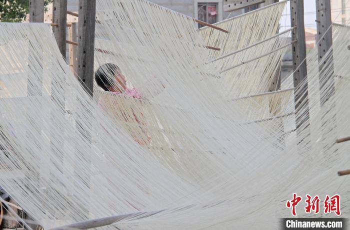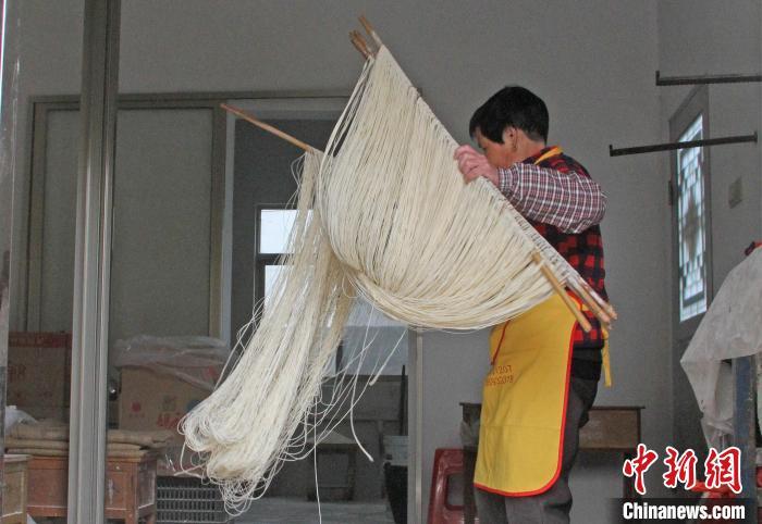两名社员正在收拾晾晒加工生产的寿面。林弘梫 摄