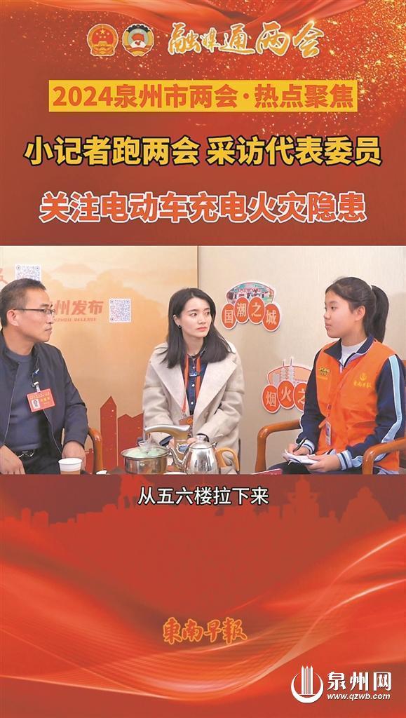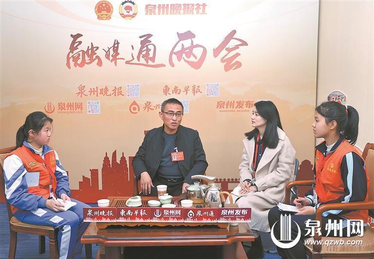 结束实地走访后,两名小记者马不停蹄地前往泉州晚报社“融媒通两会”工作室,采访了市人大代表杨振显。杨振显是鲤城区金龙街道古店社区党委书记,他联系多年工作实际,与小记者们分享了他对电动车充电问题的看法和思考。