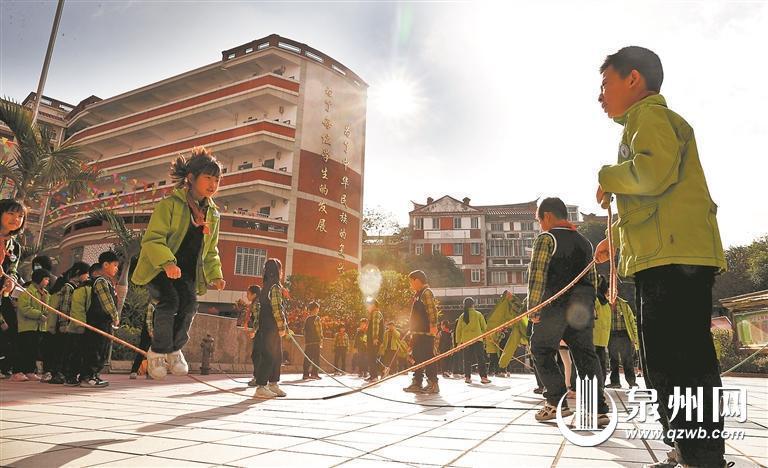 在鲤城区实验小学总校区,下课铃声一响,孩子们跑出教室,有的到操场跑步、打篮球,有的围在一起投沙包、跳绳,有的兴奋地玩着闽南童玩游戏跳格子、翻花绳……校园里充满欢声笑语。