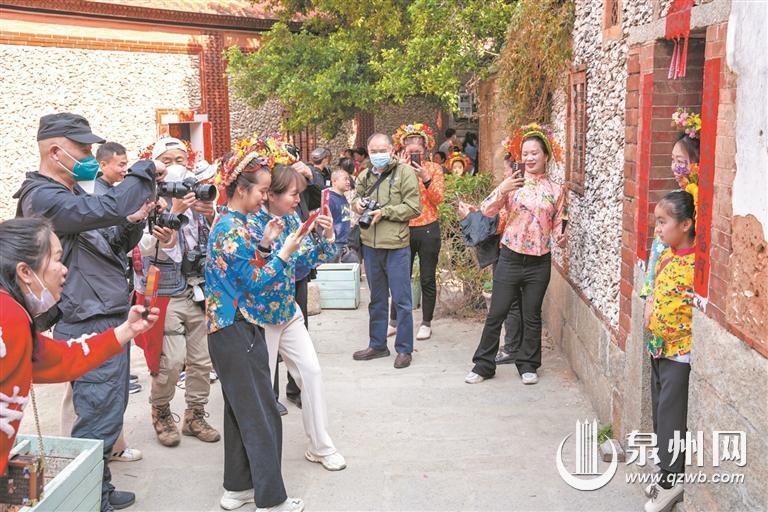 这里人头攒动如同“流动的花园”。全国各地的游客们纷纷来泉州簪花围,做一回“海的女儿”,蟳埔的蚵壳厝则是最好的背景,也是一道亮丽的风景线。蚵壳也就是海蛎壳,在蟳埔,随处可见头戴簪花围的阿姨们坐着开海蛎。