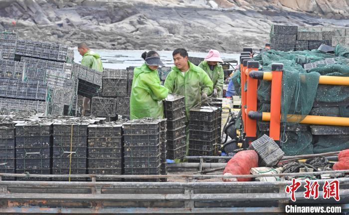 养殖工人正在把分苗整理完的鲍笼搬上转运船,准备放回网箱进行分区饲养。林弘梫 摄