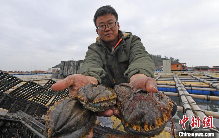 养殖户正在展示长势良好的产品鲍鱼。林弘梫 摄