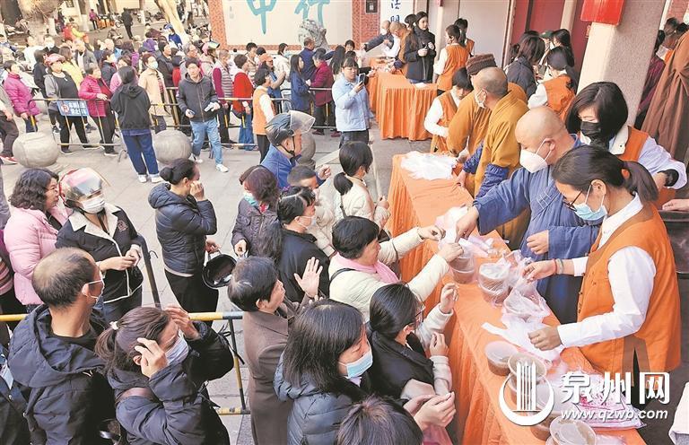 “粥里都是好料,可讲究了,慢慢品尝,真香呀!”家住泉州中心市区的谢女士喝完一碗热乎乎的粥,热心地向旁边的民众介绍起腊八粥的由来和制作过程。据她介绍,腊八粥又称福寿粥、福慧粥,内里“五味俱全”,寓意“吉利”。我国吃腊八粥的历史已有1000多年,最早始于宋代。每逢腊八这天,不论是朝廷、官府、寺院还是黎民百姓家,都要做腊八粥。到了清朝,喝腊八粥的风俗更是盛行。在宫廷,皇帝、皇后、皇子等都要向文武大臣、侍从宫女赐腊八粥,并向各个寺院发放米、果等供僧侣食用。在民间,家家户户也要做腊八粥祭祀祖先,合家团聚一起食用,并馈赠亲朋好友。