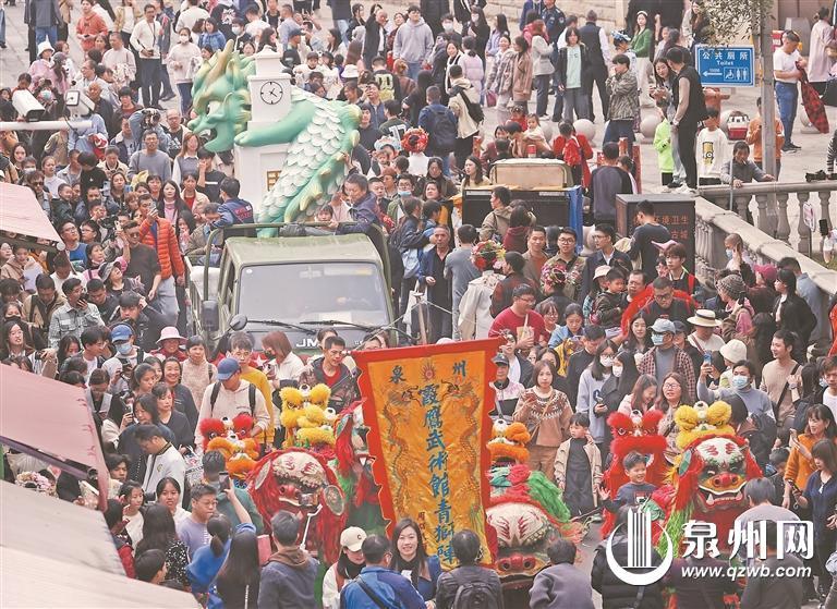 青狮队伍开道,“蒲牢”经过西街开元寺。