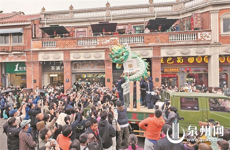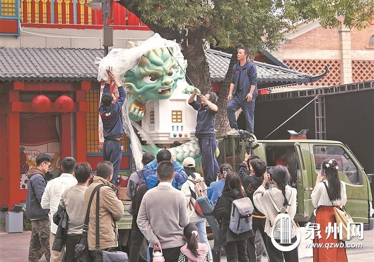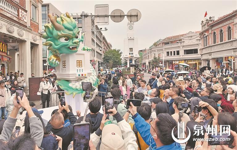“十龙九子”首龙“蒲牢”亮相泉州古城西街,众多市民游客争相拍照打卡。
