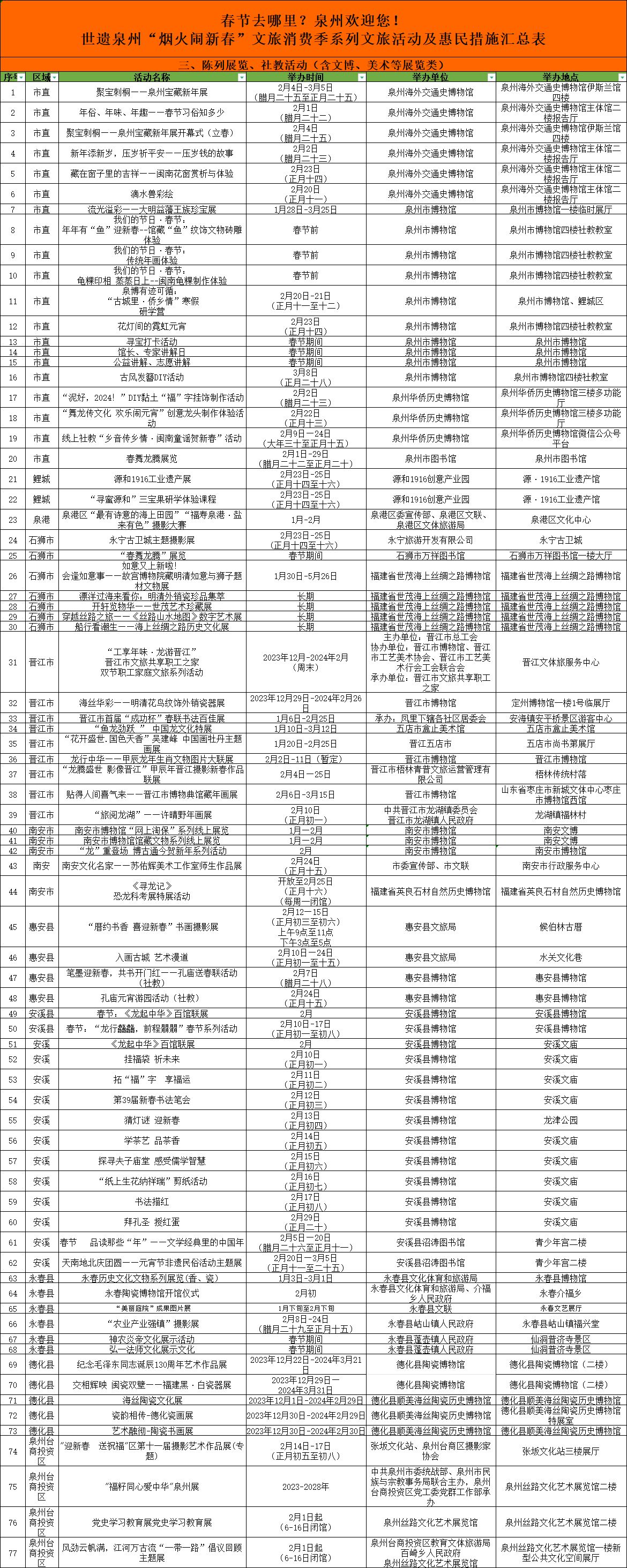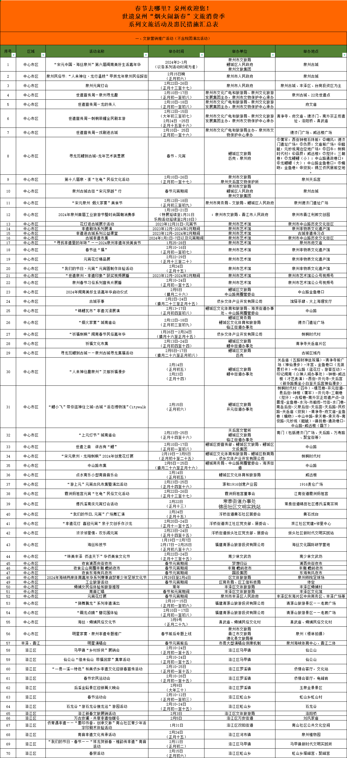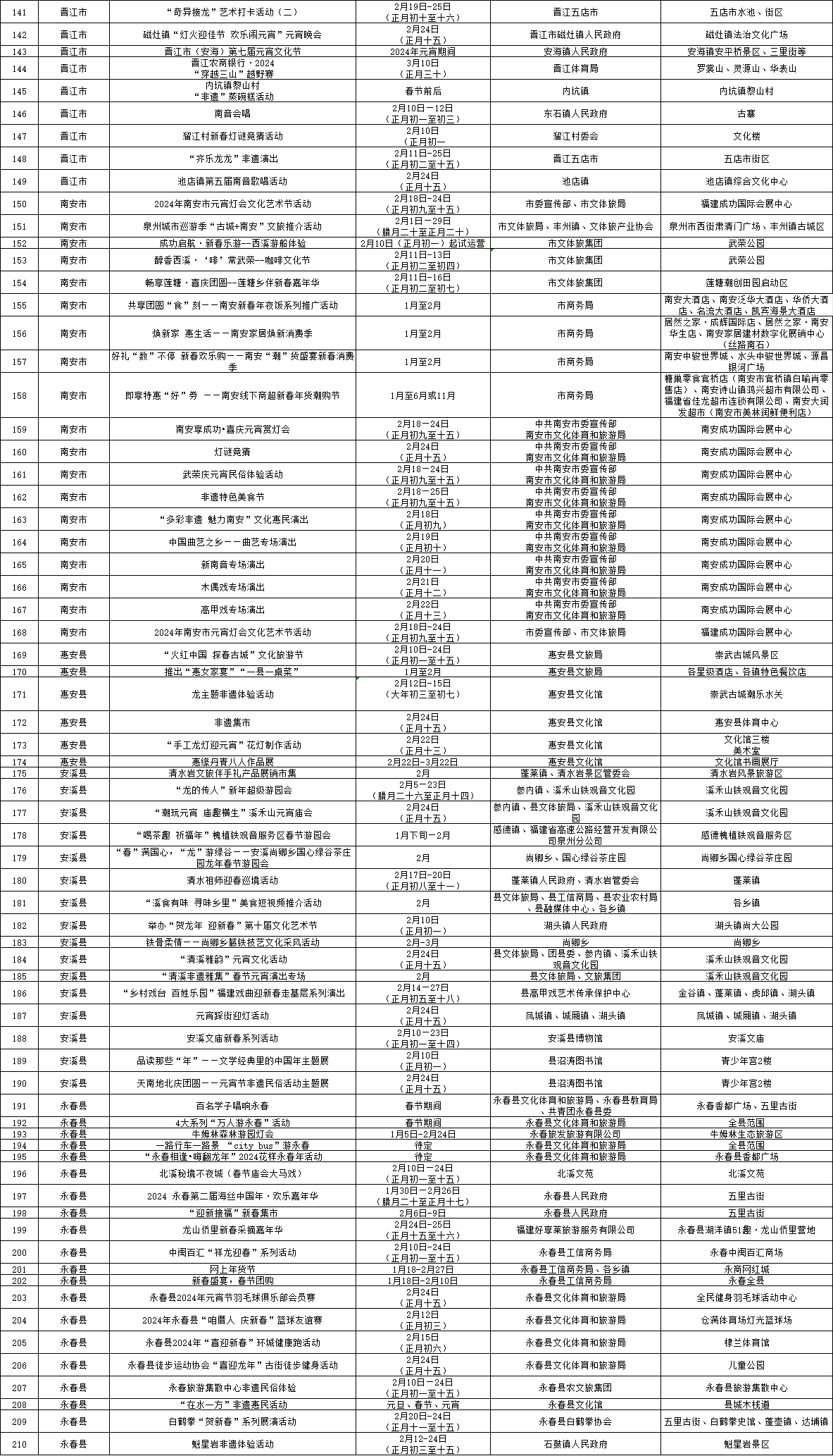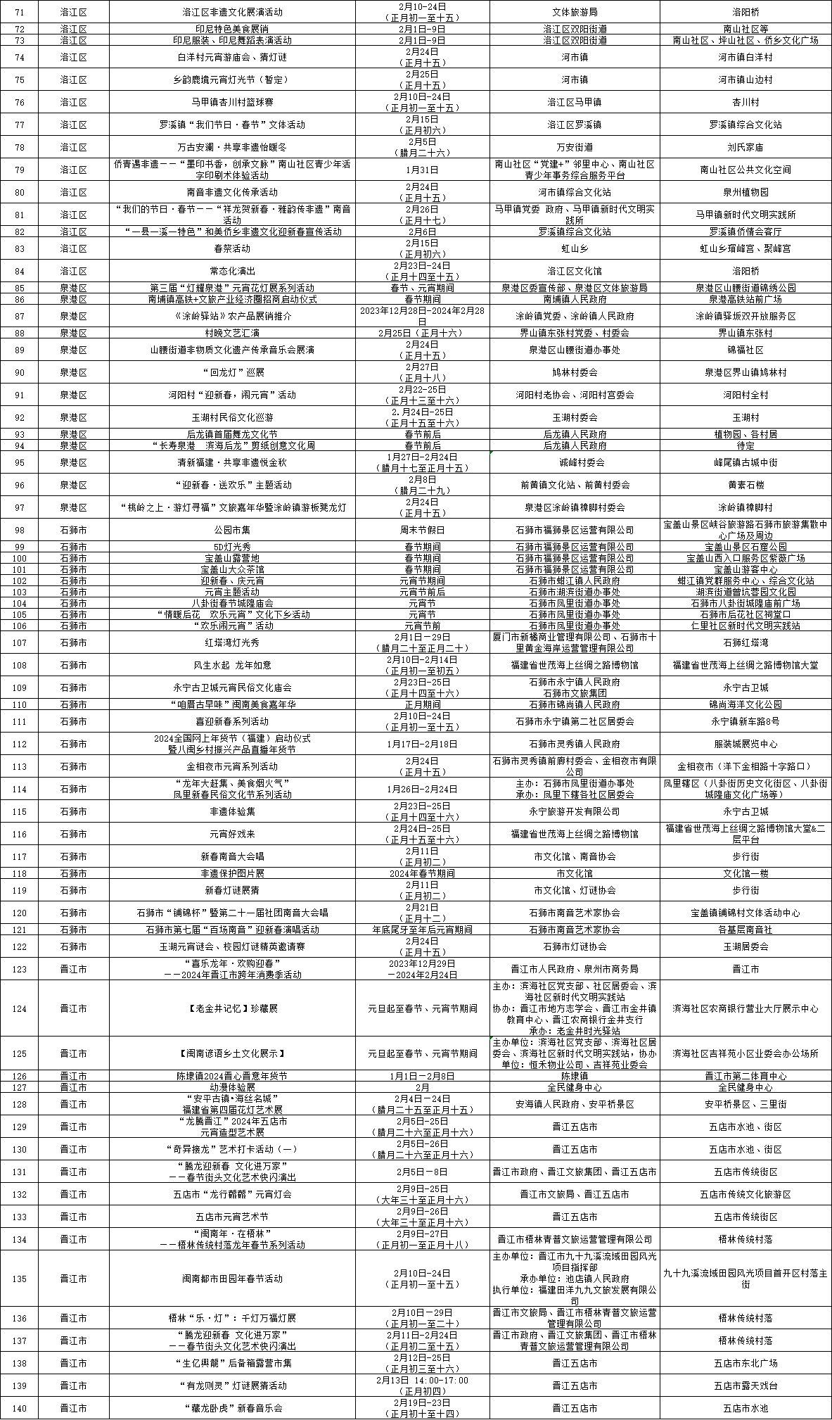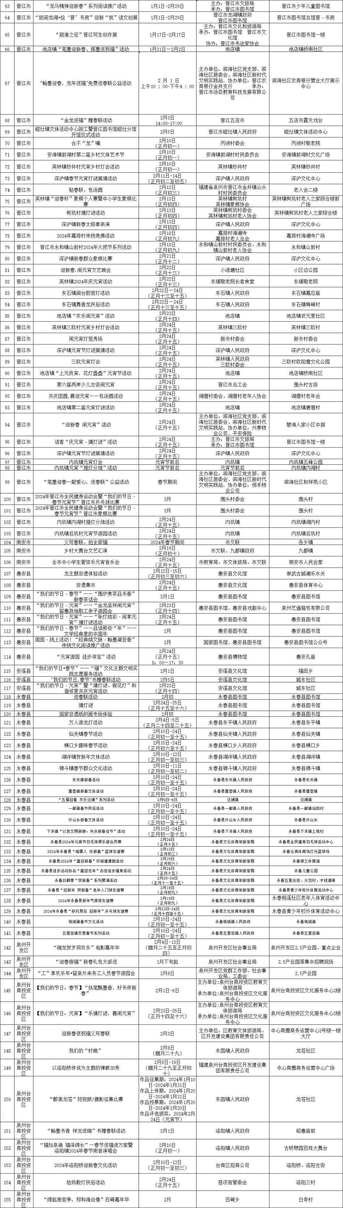 其他地方活动同样多姿多彩,如泉港区第三届“灯耀泉港”花灯节、石狮市“来狮转运 五福临门”新春文旅系列活动、晋江市“龙腾盛世 来去晋江”文体旅新春消费季、南安市“福见南安·享成功”祥龙登场乐购狂欢季、惠安县“火红中国 探春古城”文化旅游节、安溪县“溪时有味”——过佳节·兴文旅·促消费春节元宵主题系列活动、永春县第二届海丝中国年·欢乐嘉年华、德化县生肖陶瓷文创嘉年华、泉州开发区“花样迎新”系列文化活动暨“福龙迎春 乐购清濛”全民购物节、台商投资区欧乐堡龙腾鱼跃过大年等。
