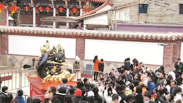 昨日下午3时,冬日暖阳照在泉州东街新府口的元妙观,“十龙九子”龙生肖艺术装置第六件作品“睚眦”(yá zì)在此起彼伏的欢呼声中亮相,吸引市民里三层外三层围观。