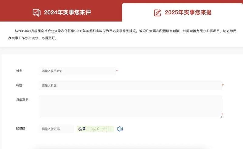 从2024年1月起,省政府门户网站面向社会公众常态化征集省委和省政府办实事项目意见建议,欢迎广大网友积极建言献策,共同完善为民办实事项目,助力为民办实事工作办出实效、办得更好。