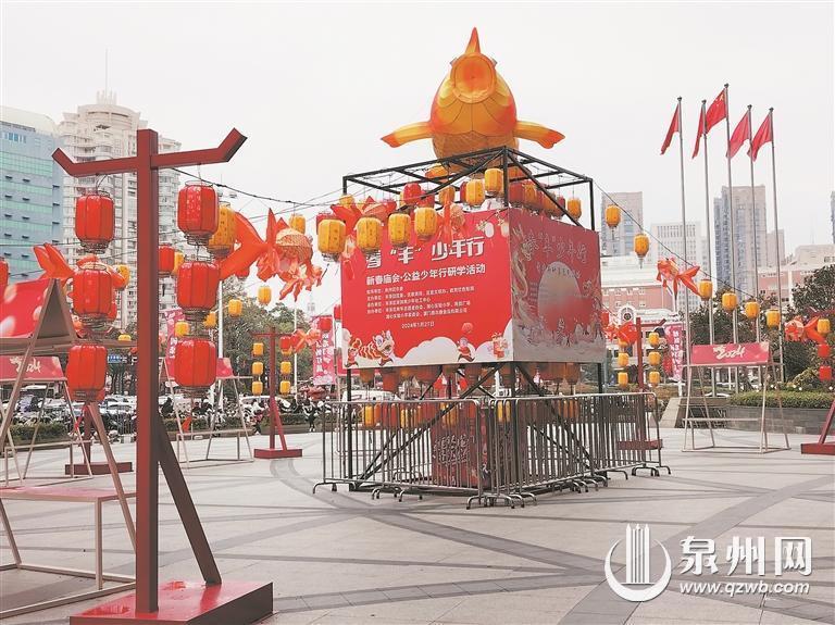走进泉州商城广场,龙珠音乐喷泉周围布置了灯串、灯带,一到夜晚灯火璀璨。泉州真武庙美食广场,红灯笼高高挂起,“福”字造型、福袋的灯光装置已陆续上街,加之石头街上的红砖赤瓦、古榕参天,让整个街区既古香古色又年味浓浓。在丰泽街的南益广场,布置着鲤鱼跃龙门的景观,非常漂亮。