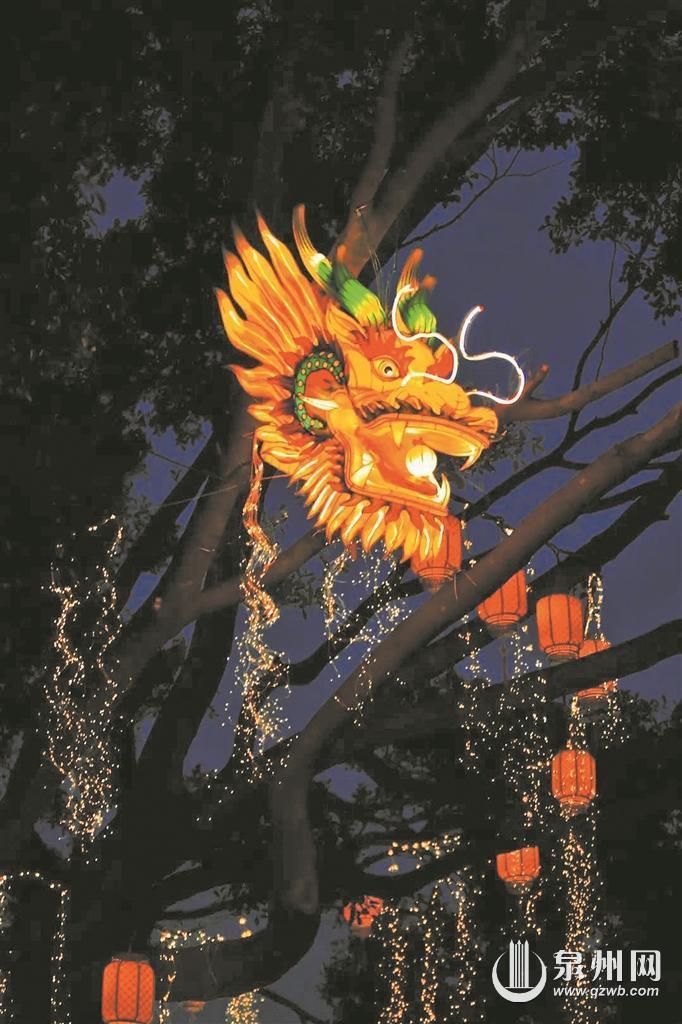 在古城中山北路与镇抚司巷的交叉路口,三株大榕树灯光璀璨。靠南侧的榕树树干上缀满灯光,枝头还挂了马尾灯、藤球灯;北侧的榕树枝叶间垂挂着许多马尾灯以及显眼的龙头花灯,远远望去,仿若一条巨龙盘旋在三株榕树间。