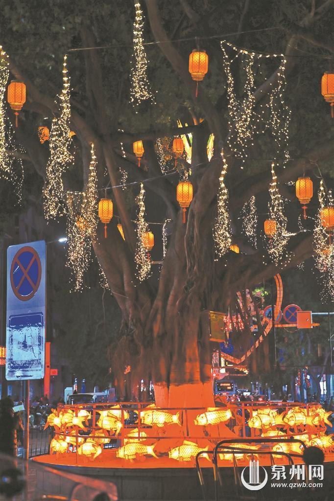在濠沟墘与庄府巷交叉路口,三株大榕树也挂上了亮眼的“鲤好”和双塔霓虹灯牌,与周边的暖色藤球、星星灯、七彩绣球灯、幻彩鱼灯等相呼应,灯火璀璨,让整株大树在夜晚散发光芒,吸引了不少市民游客驻足拍照。据介绍,此点位共悬挂了20盏幻彩鱼灯,寓意“海阔凭鱼跃、百鲤竞争游”,与“鲤好”霓虹灯牌共同祝福鲤城新的一年迈向更加美好的未来。