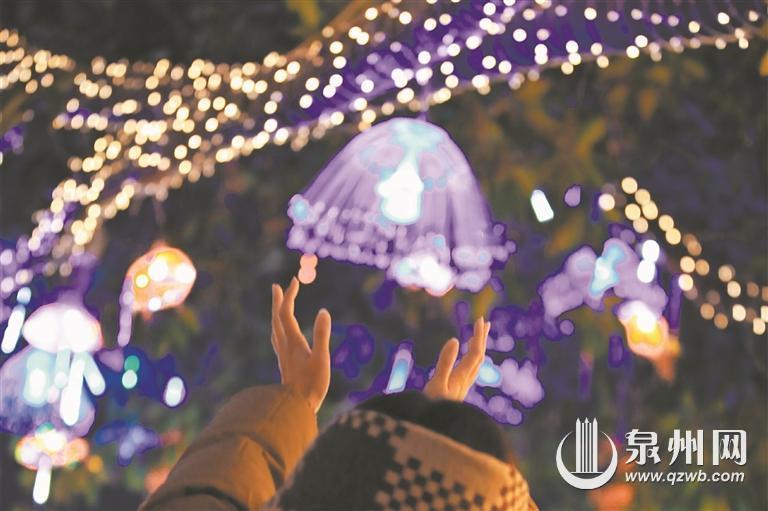 古城临漳门城门前的三株大树缀满了七彩水母灯、幻彩鱼灯、七彩流星灯,树干上缠绕满天星灯带。夜幕降临,随着灯光亮起,三株大树化身成“奇幻海洋”,一只只发光“水母”“小鱼”变换着色彩,更显灵动。远远望去一片灯火绮丽,不仅好看,拍起来也十分“出片”,仿若一秒“穿越”到绮梦幻境之中。临漳门环岛周围还设置了“鲤好2024”“海丝泉州,魅力鲤城”“世遗古城,与鲤同行”等主题灯箱。
