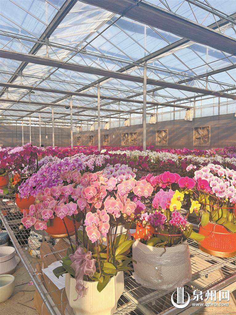 在洛阳镇旭日生物科技基地的大棚内,一株株蝴蝶兰长势喜人,有的含苞待放,有的盛开白的、粉的、黄的、红白相间不同颜色的花,生机勃勃。春节临近,基地订单不断。眼下,商户正忙着打包花卉、装车发送。“我们主要做蝴蝶兰,有一两百个品种,今年产量有13万株,通过线上和线下售出,销量比去年同期增长了百分之二三十。”泉州旭日生物科技股份有限公司总经理卢建龙介绍。