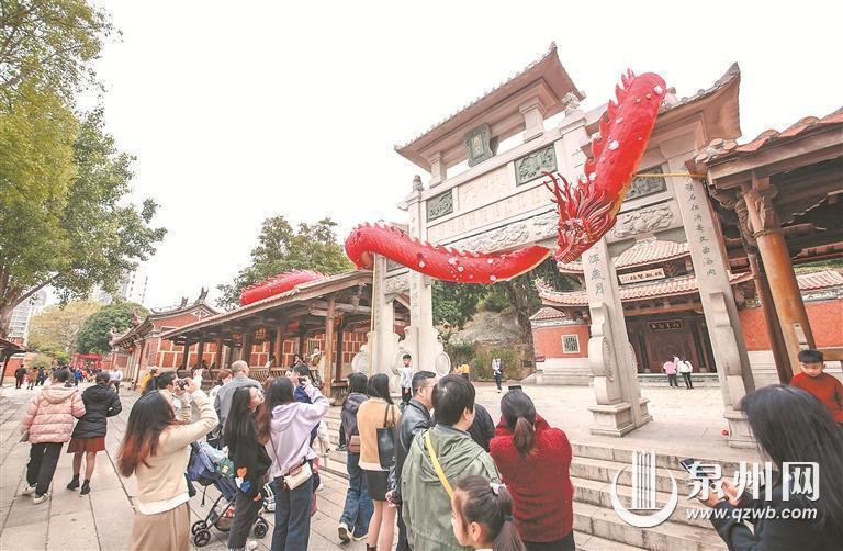 日前,“簪花龙”亮相晋江五店市传统街区,吸引了众多市民、游客驻足拍照。“簪花龙”艺术装置长60余米,跨越桃花叠浪亭子,盘踞于状元牌坊之上,与池中鲤鱼装置共同组成“鲤鱼跃龙门”之景。 (融媒体记者许雅玲 林劲峰 摄)