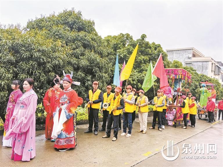 “前面的队伍稍微慢些,后面的队伍紧跟上去,大家步伐保持一致。”彩排现场,身着鲜艳服饰的巡游队伍聚在一起,紧锣密鼓地彩排预演着,现场锣鼓阵阵、南音袅袅,场面相当喜庆热闹,吸引了附近村民前来观看。