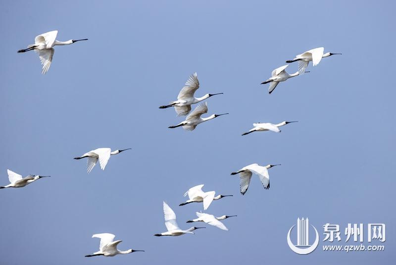 除了黑脸琵鹭、白鹤,活跃在泉州辖区湿地的国家级重点保护鸟类种类繁多,如黄嘴白鹭、白琵鹭、勺嘴鹬、黑翅鸢、大杓鹬、大滨鹬、小青脚鹬、黑嘴鸥、豆雁、苍鹭、反嘴鹬、红嘴鸥等。