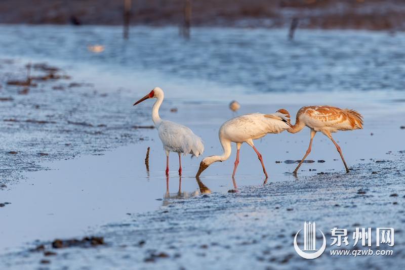 每年冬季,白鹤从寒冷的西伯利亚南下越冬,主要目的地都是江西鄱阳湖。2023年12月,两只成年白鹤和一只白鹤亚成鸟出现在泉州湾水头外线石狮和晋江交界处湿地。据泉州市观鸟学会观测记录,这是继2020年11月白鹤“首次入闽”后,泉州第四次记录到白鹤。白鹤,全球极危物种,属国家一级保护动物,全世界仅存约4000只,享有“鸟类活化石”美称。据观测,今年到访的这三只白鹤,两只白色是雌雄一对,黄褐色则是亚成鸟,这也是泉州第一次有白鹤亚成鸟到访记录。