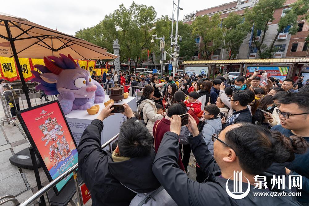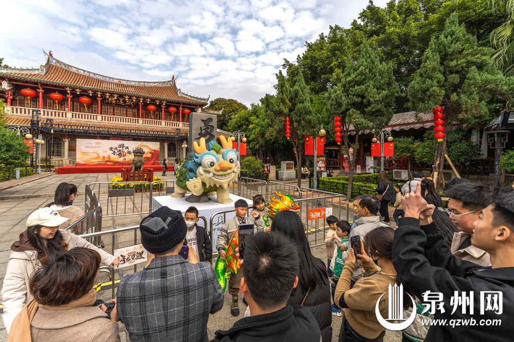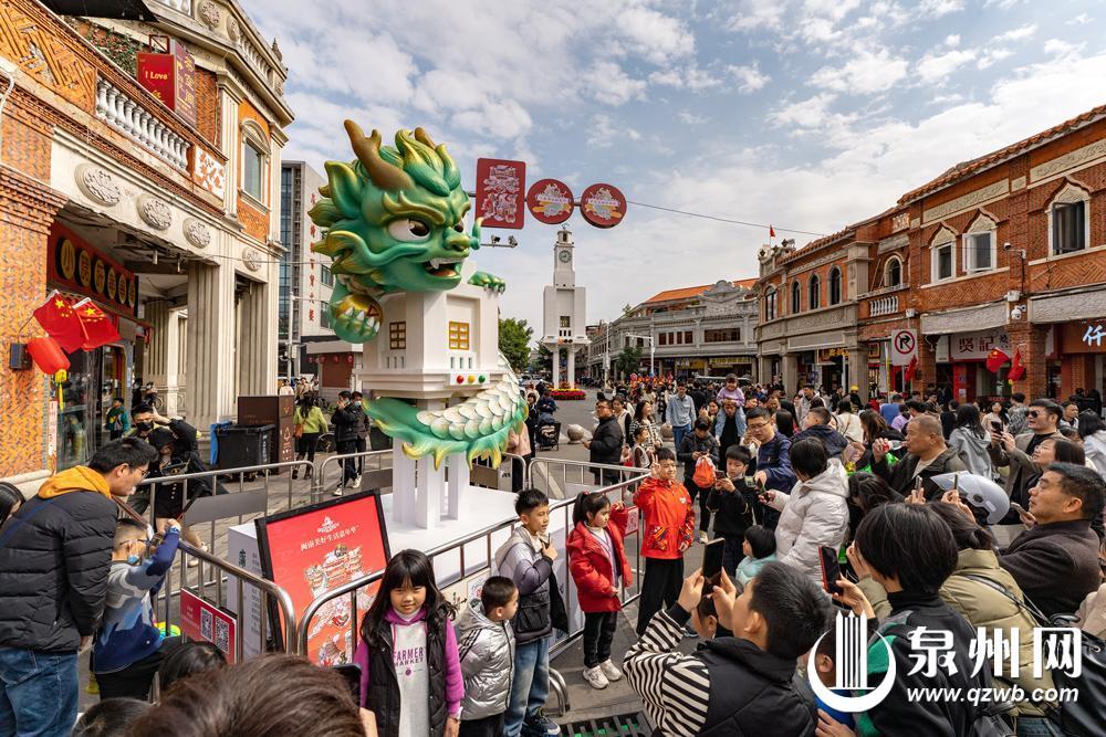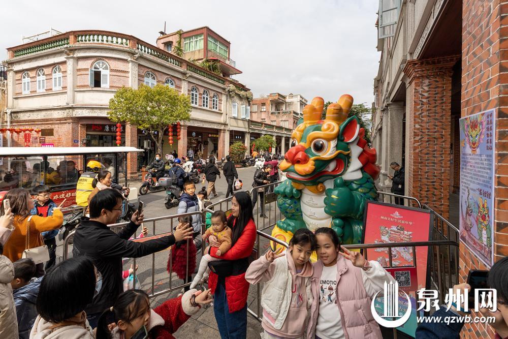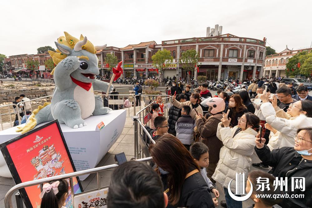 新春佳节来临之际,泉州古城喜气洋洋。布置在不同点位的大小青龙和“龙众九子”吸引市民、游客逐一打卡拍摄,古城出现万众寻“龙”的热闹场面。(融媒体记者陈起拓 摄)