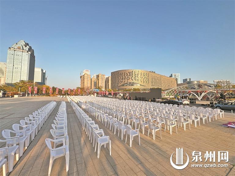 昨日15时许,在金花人民广场前的滨海街上,工人们有条不紊地搭设着主舞台。现场负责人陈金灿介绍说,舞台将于当晚搭设完毕,背景中有泉州特色燕尾脊元素。