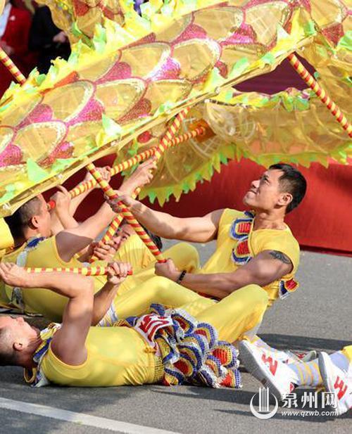 接着是晋江舞龙队方阵。锣鼓响起,整条龙翻滚、升腾,气势磅礴,体现出了泉州人勇立潮头、爱拼敢赢的拼搏精神。