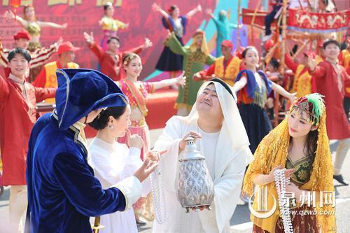 大开道和五音吹方阵演员着盛装,奏鼓乐,开道前行,阵容庞大,富有浓郁的民族特色和地方风情。泉州歌舞剧院的《市井十洲人》方阵展示了宋元时期泉州海外贸易的发展盛况。安溪的泉州妆阁(湖头水车阁)方阵其独特的水车造型和妆阁的华丽装饰相得益彰,水车上的孩童着古装扮相,与扮演宋元时期的泉州人民的演员们共同组成当时的迎番队,彰显了自古以来泉州人包容好客的精神面貌。此方阵掀开了第一篇章,再现宋元泉州“市井十洲人·涨海万国商”。