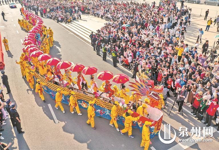 30个方阵、30项非遗项目,1500多名演职人员走上街头,或行进间表演,或定点展演,有绚丽多彩的“泉州龙龙”彩车,有独具特色的拍胸舞、火鼎公婆等民间艺术,还融入了新潮时尚的国潮元素,尽显历史文化名城民间艺术原味与特色,为市民游客奉上一场文化的饕餮盛宴。