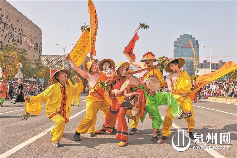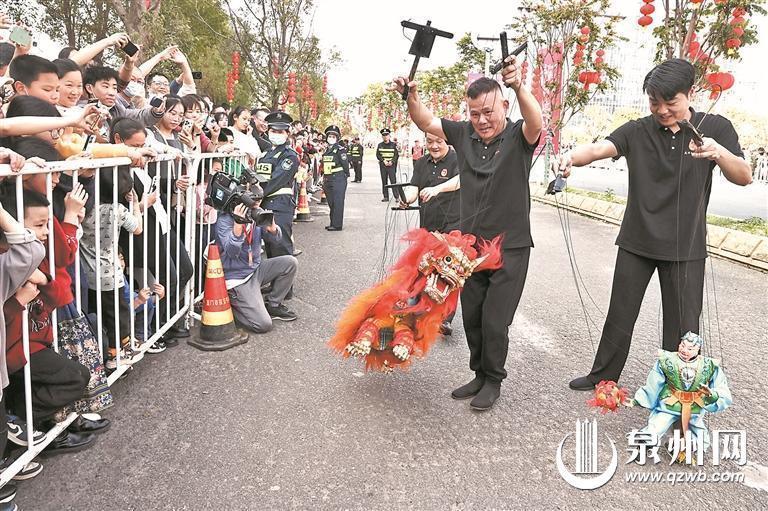 随后,拍胸舞、火鼎公婆、踢球舞、嗦啰嗹、英都拔拔灯、泉州南音,为市民游客带来节日的喜庆气氛,展现了泉州“千家管弦鸣”的盛景和“半城烟火半城仙”的气息。由梨园戏、高甲戏、打城戏、木偶戏与南音所组成的泉州五大剧种乐种方阵,展示了戏曲艺术的无限魅力。而气势恢宏的南少林武术、俞家棍、白鹤拳、泉州刣狮、扁担术和青狮等,彰显了泉南“处处少林风”。