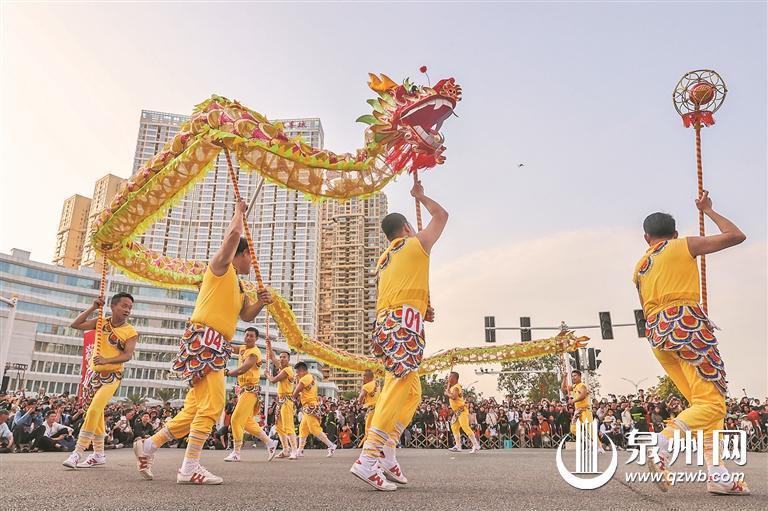 随着锣鼓响起,晋江舞龙队方阵出场,只见龙翻滚、升腾,气势磅礴,体现出了泉州人勇立潮头、爱拼敢赢的拼搏精神。