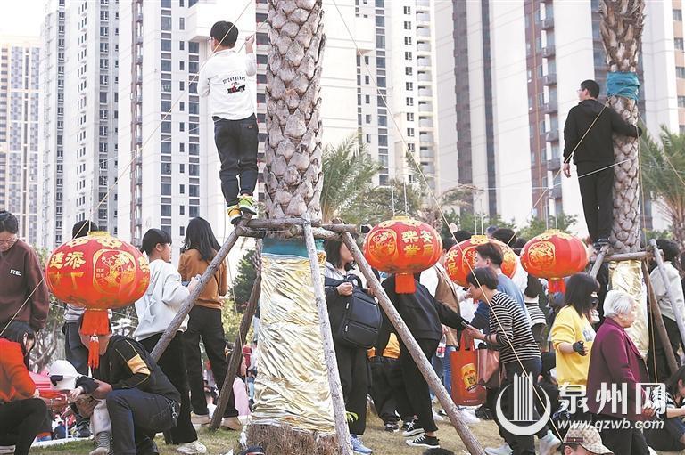 2月15日,在泉州东海中央商务区滨海街,游客冒险攀爬到绿化上看热闹,把自己置于危险之中。(王柏峰 摄)