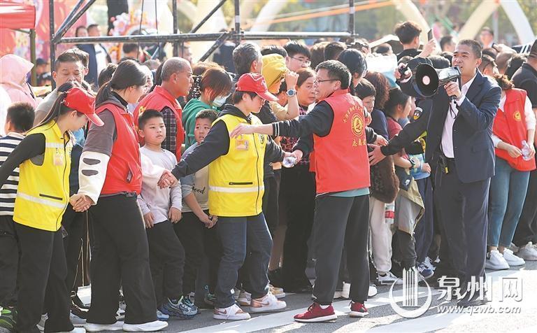2月15日,在泉州东海中央商务区的民俗踩街现场,志愿者们手拉手组成“人墙”,维持现场秩序。(王柏峰 摄)