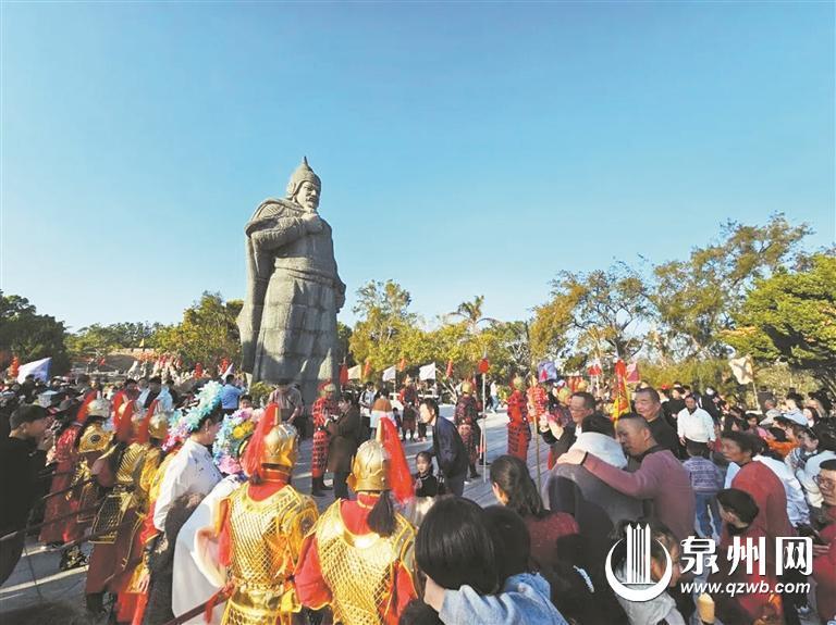 游客在戚继光雕像前观看武备甲胄表演(惠安文旅集团供图)