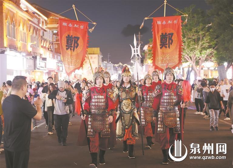 昨晚6时30分,数名士兵装扮的演员齐聚泉州中山路花巷口。他们有的执长剑,有的握长枪,有的扛战旗,从花巷口出发一路行进,抵达泉州钟楼。半个小时的巡游,在温暖的灯光下,人潮涌动,不少市民游客纷纷拿起手机,跟巡游队伍来个合影。