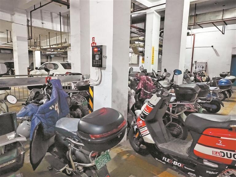 在丰泽街的冠亚城市花园小区,电动车部分停放在车辆通道旁,地下停车场也划出位置给电动车充电、停放。记者注意到,这里的充电设备可预定时间,充完就自动断电,避免过充。