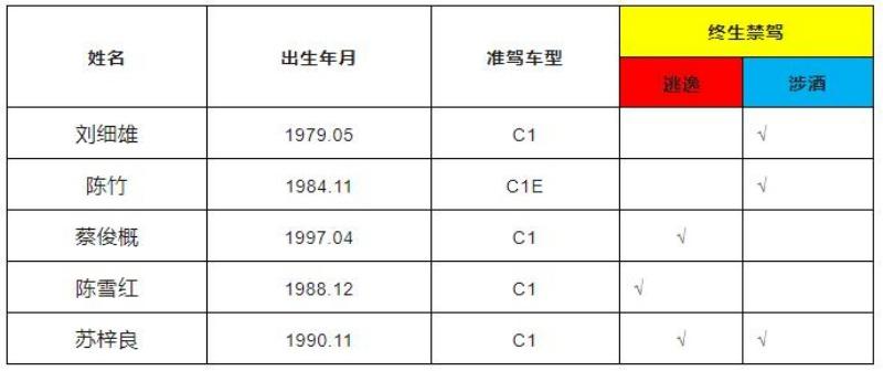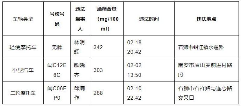 泉州网2月26日讯(记者洪荣堆 通讯员赵美缘)26日,泉州交警对2月以来查处醉驾血液酒精含量280mg/100ml以上的驾驶人和多次饮酒后驾驶机动车的驾驶人进行集中曝光,向社会公布2月被吊销机动车驾驶证且终生禁驾的5名驾驶人名单,推进交通安全警示宣传。