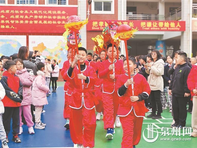 无独有偶,泉港庄重文实验小学的开学典礼也在一场舞龙表演中“龙”重拉开序幕。伴随着“咚咚咚”的鼓声和激昂的音乐,一条金龙和一条紫龙分别从舞台两侧翻腾起舞,龙的造型变换多样,一会摆成“中国”的字样,一会摆成“龙”的字样,赢得师生们的阵阵喝彩。