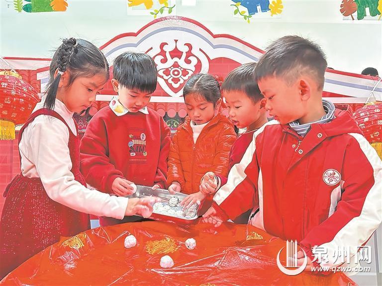 泉州网2月28日讯(融媒体记者陈森森 通讯员张绵绵 文/图)滚元宵、扎花灯、玩民俗游戏……近日,泉州市丰泽幼儿园开展了“我们的节日·元宵”一系列丰富多彩的庆祝活动,将传统文化融入各班的主题活动中。同时在家长与老师们的带领下,孩子们还参加了观踩街、逛灯会、童谣传唱等活动,充分感受喜庆、欢乐、吉祥的传统民俗文化。庆祝活动不仅培养了小朋友们的动手动脑能力,而且让幼儿接受本土文化的浸润与滋养,加深幼儿对传统文化的认同感。