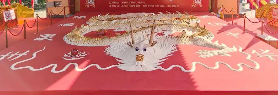 “米龙”由大米堆砌而成,总长35米,用了3500斤大米,由台湾的吉尼斯世界纪录团队耗时三天完成,寓意龙年平安吉祥,生活美满。