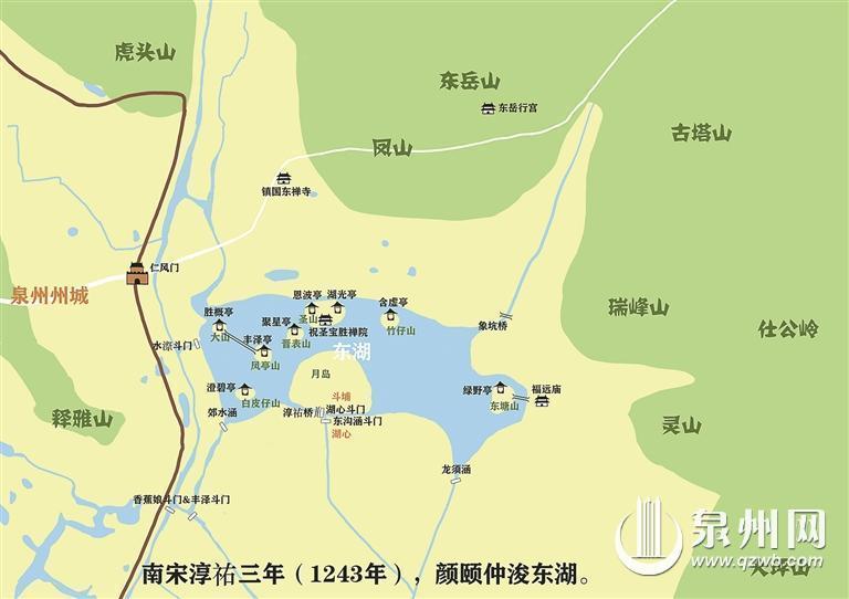 位于市区温陵路东侧的泉州东湖,自唐代泉州建城以来,就是一处风景名胜。“西汉建元六年,古东湖为晋江河道的一部分;唐垂拱年间,东湖初步成形。”许晟恒介绍,历史上东湖最大面积达40顷(4000亩),古东湖之范围北抵象坑、柑舍头(甘蔗头)、东岳山麓、清源山麓、后茂工业区南、牛臀石(已炸毁),西抵松湾古地、二郎巷、释雅山,南抵津头埔、后坂、田庵、天水淮等地,东抵云谷、灵山、瑞峰一带。自形成以来,因地壳抬升,东湖经历着不断淤塞、面积不断缩小的过程。