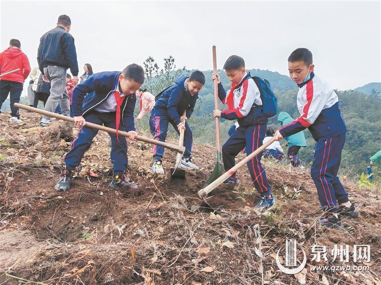 在植树节来临之际,3月10日,泉州市晋光小学东海校区师生联合泉州罗溪国有林场开展“拥抱春天 植此青绿”植树节活动。短短半天时间,晋光小学师生和林场员工一起种下100多棵幼苗,为泉州的绿水青山贡献力量。(融媒体记者许永华 通讯员陈瑞娜 摄)