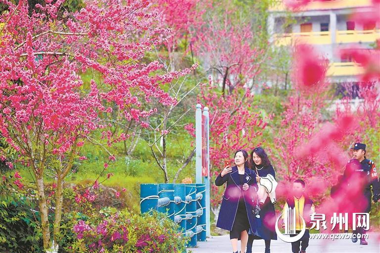 永春县北溪文苑的桃花此时正迎着春风,层层叠叠覆盖在枝头上。不少游客驻足桃树前,与鲜艳娇美的桃花合影留念。