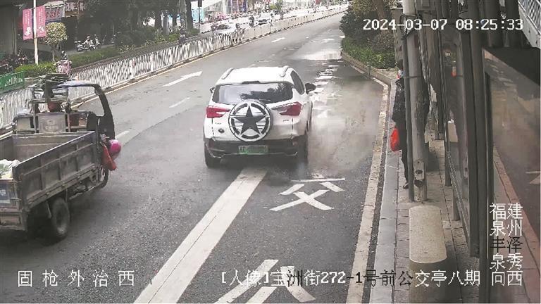 近日,丰泽交警接到群众举报,当事人称在站台等公交时,一辆白色小车疾驰而过,溅了自己一身污水。丰泽交警一中队立即展开调查,现场监控视频显示,3月7日8时25分许,在市区宝洲街中段公交站,一部白色小车行经公交站旁的积水路段时未减速通过,溅了两名等公交的市民一身积水后扬长而去。