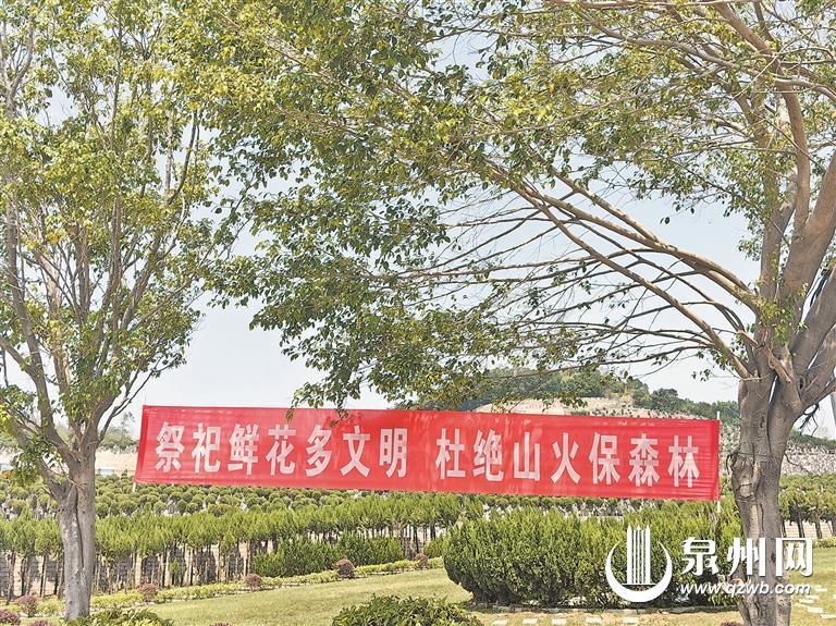 宏福园内悬挂着倡导文明祭扫的标语