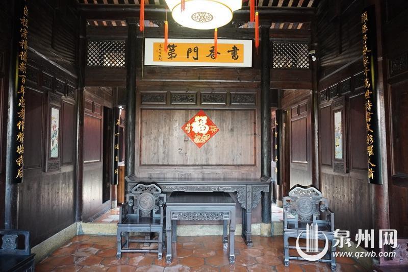 厅堂上挂着 “书香门第”匾额,两侧是复制的祖训对联。
