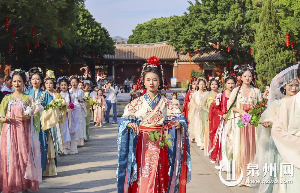 汉服霓裳赴春约 2024刺桐花主题文化活动暨“花朝之节春有约”花朝节活动日前举行,百余名汉服爱好者齐聚世遗景点府文庙,上演华丽汉服秀。(郑银杰 摄)