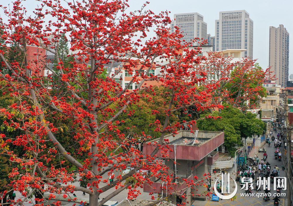 几树半天红似染 泉州五中桂坛校区门口,木棉花开红似火。(彭燕珍 摄)