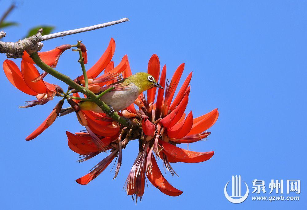 刺桐花开绛雀啼 刺桐花开刺桐城,红艳艳的花朵总能吸引各种鸟类。(陈朝阳 摄)