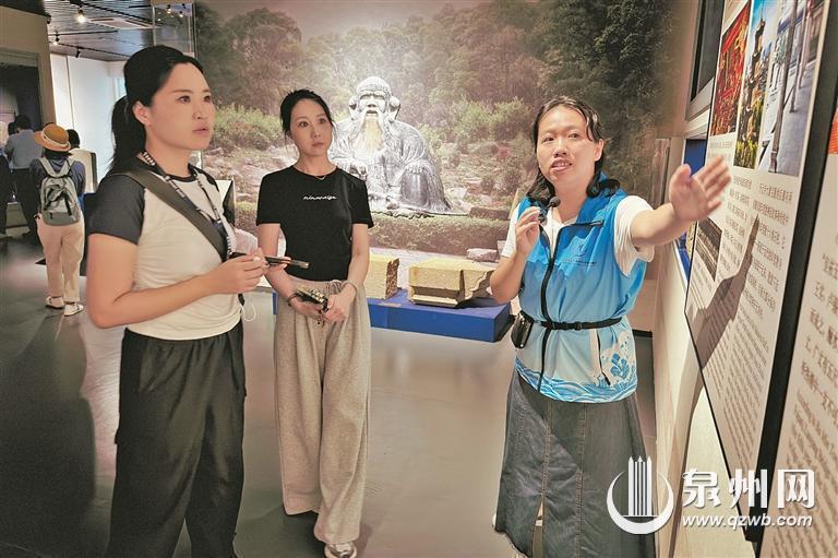 与此同时,几名讲解志愿者正在馆内为游客提供讲解服务。“我们尽最大努力,用专业和热情为游客提供优质讲解服务,展现泉州的良好形象。”来自泉州经贸职业技术学院的林洁玲老师,正忙着为一批外地游客解说泉州外来宗教石刻的来历。